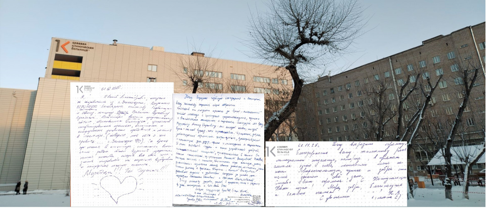 «Хочу сказать огромное спасибо, хирургу Рудых Константину Алексеевичу (отделение ренгенхиругических методов диагностики и лечения), лечащему врачу Андрееву Дмитрию Анатольевичу, и всему медицинскому коллективу кардиологического отделения N3 КГБУЗ ККБ. Выразить благодарность за успешно проведанную операцию 14.11.2025 по стентированию коронарных артерий. Спасибо за профессионализм, чуткость и внимание. Нет никаких нареканий, не к чему придраться. Низкий вам поклон! Чувствую себя значительно лучше. Желаю вам крепкого здоровья, и только успешных операций. С уважением, Л. К.»